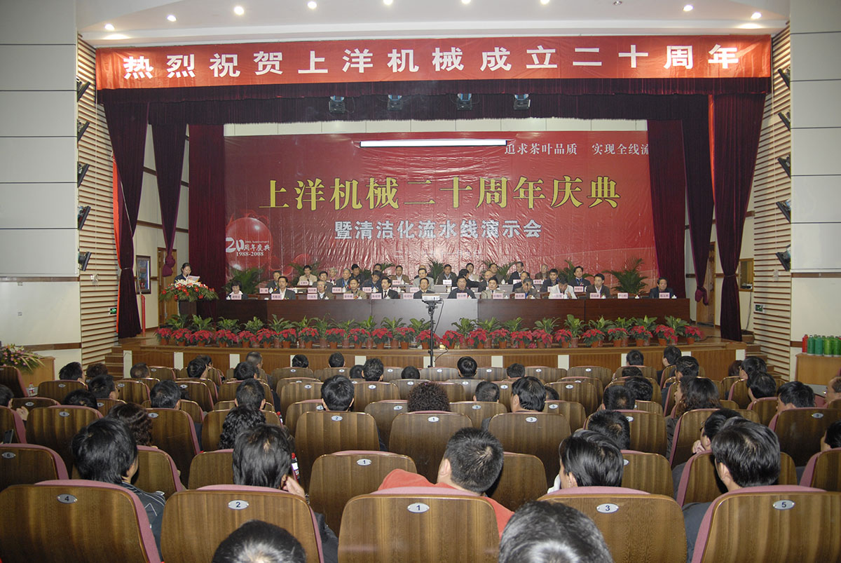 • 2008年,企業(yè)喜遷辦公大樓,上洋二十周年慶典隆重召開(kāi),來(lái)自社會(huì)各界領(lǐng)導(dǎo)及茶界專家、客戶共600余人參會(huì)。企業(yè)以“使清潔化更清潔,讓流水線流起來(lái)”為理念,引導(dǎo)茶加工產(chǎn)業(yè)發(fā)展新潮流,標(biāo)志著公司在發(fā)展進(jìn)程中邁出新的一步。