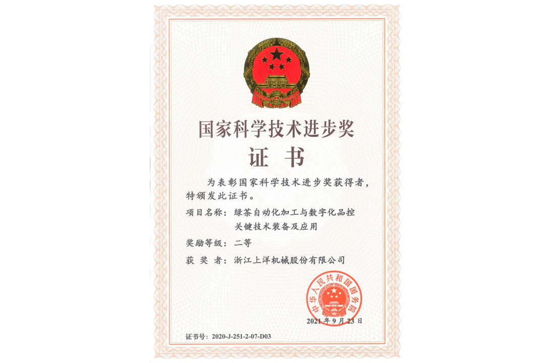 • 2021年11月3日,公司與安徽農(nóng)業(yè)大學(xué)等單位聯(lián)合申報(bào)的《綠茶自動(dòng)化加工與數(shù)字化品控關(guān)鍵技術(shù)裝備及應(yīng)用》獲得國(guó)家科學(xué)技術(shù)進(jìn)步獎(jiǎng)二等獎(jiǎng)。公司按照“品控?cái)?shù)字化-加工自動(dòng)化-技術(shù)體系化”思路,歷經(jīng)14年攻關(guān)和應(yīng)用,獲獎(jiǎng)項(xiàng)目技術(shù)及裝備推廣至我國(guó)所有產(chǎn)茶省(市、區(qū))的 1200 多家茶葉企業(yè)。