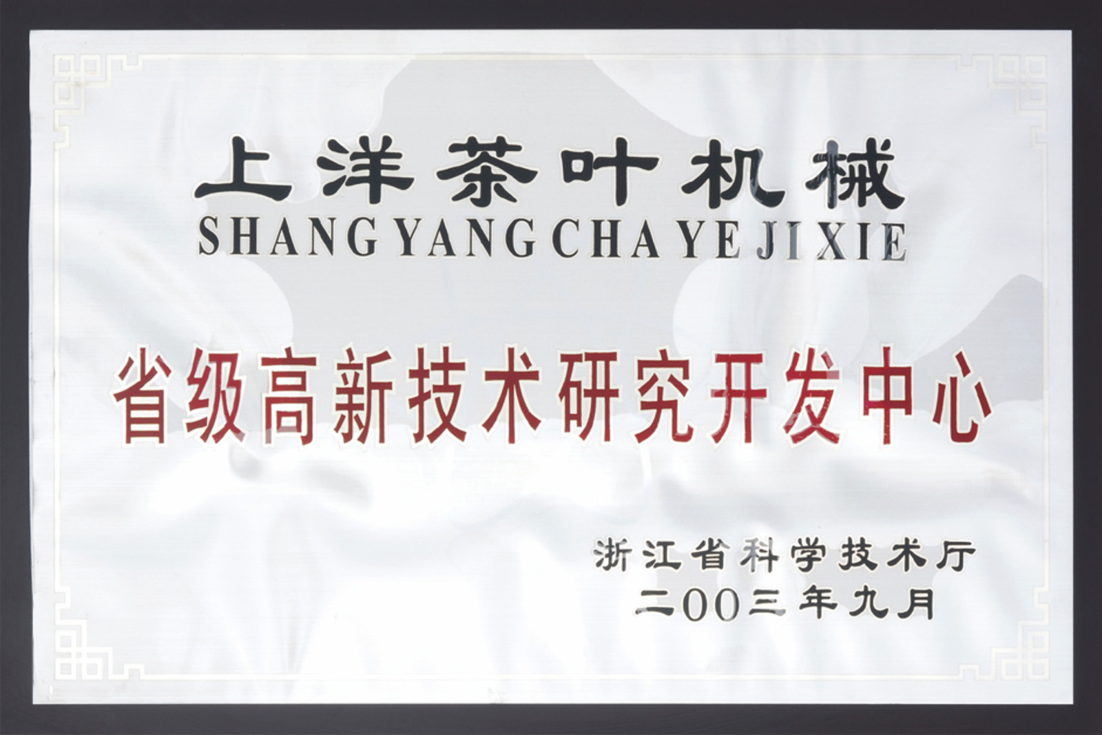 • 2003年,“上洋茶葉機(jī)械省級(jí)高新技術(shù)研究開(kāi)發(fā)中心”、“農(nóng)業(yè)部南京農(nóng)業(yè)機(jī)械化研究所上洋中試基地”先后掛牌成立,企業(yè)技術(shù)研發(fā)實(shí)力居行業(yè)領(lǐng)先水平。