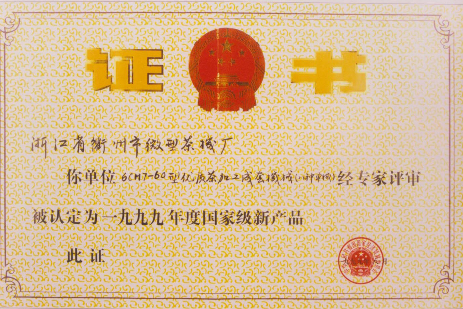 • 1992年10月,公司自主開(kāi)發(fā)的“名優(yōu)高檔茶加工成套機(jī)械”通過(guò)國(guó)家級(jí)新產(chǎn)品鑒定,促進(jìn)與推動(dòng)了我國(guó)茶葉加工向機(jī)械化、效率化、商品化方向發(fā)展。
