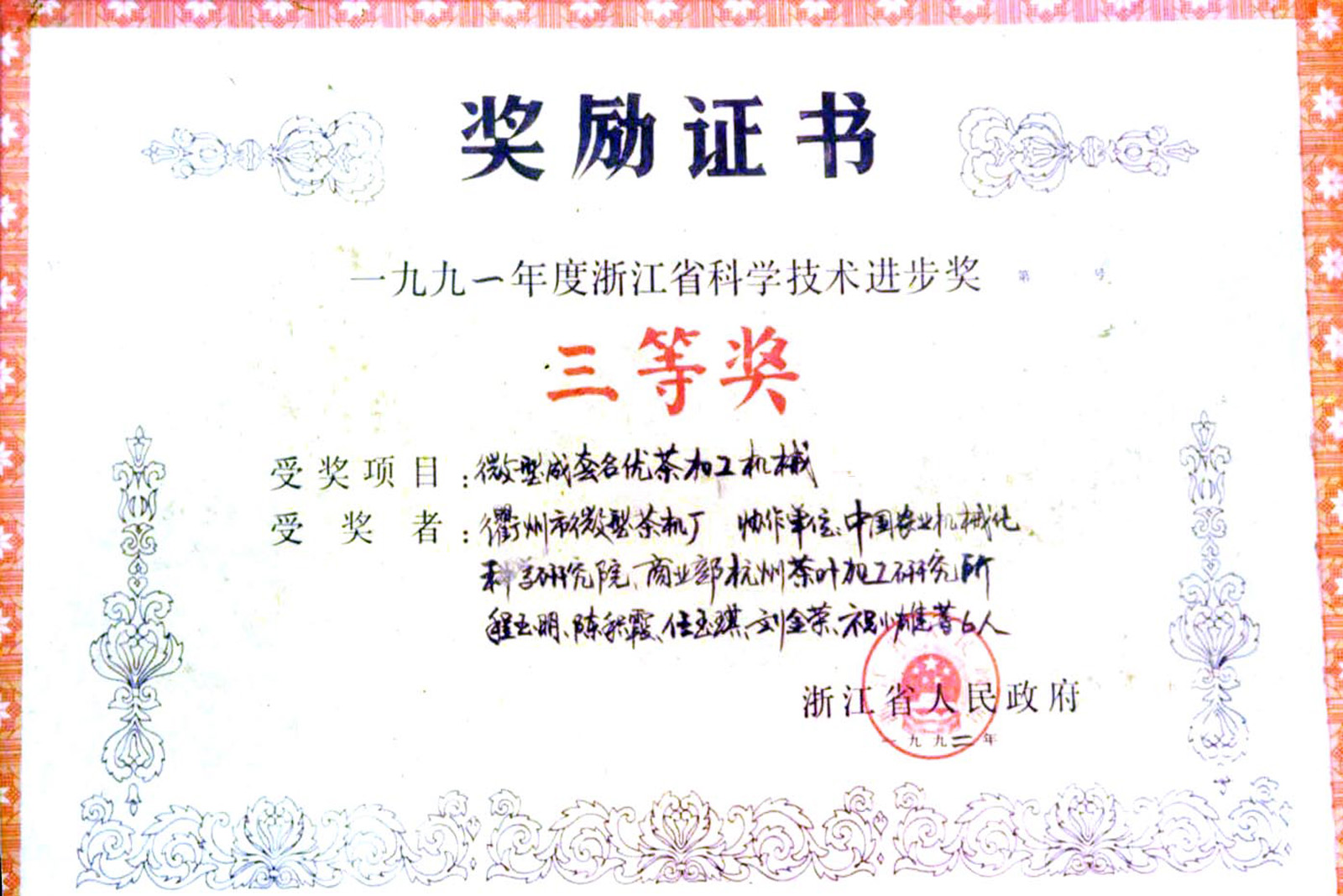 • 1991年,微型成套名優(yōu)茶加工機(jī)械通過(guò)省級(jí)新產(chǎn)品鑒定,這是國(guó)內(nèi)最早通過(guò)省級(jí)鑒定的茶機(jī)產(chǎn)品,同年該產(chǎn)品分別榮獲浙江省科技進(jìn)步三等獎(jiǎng)。