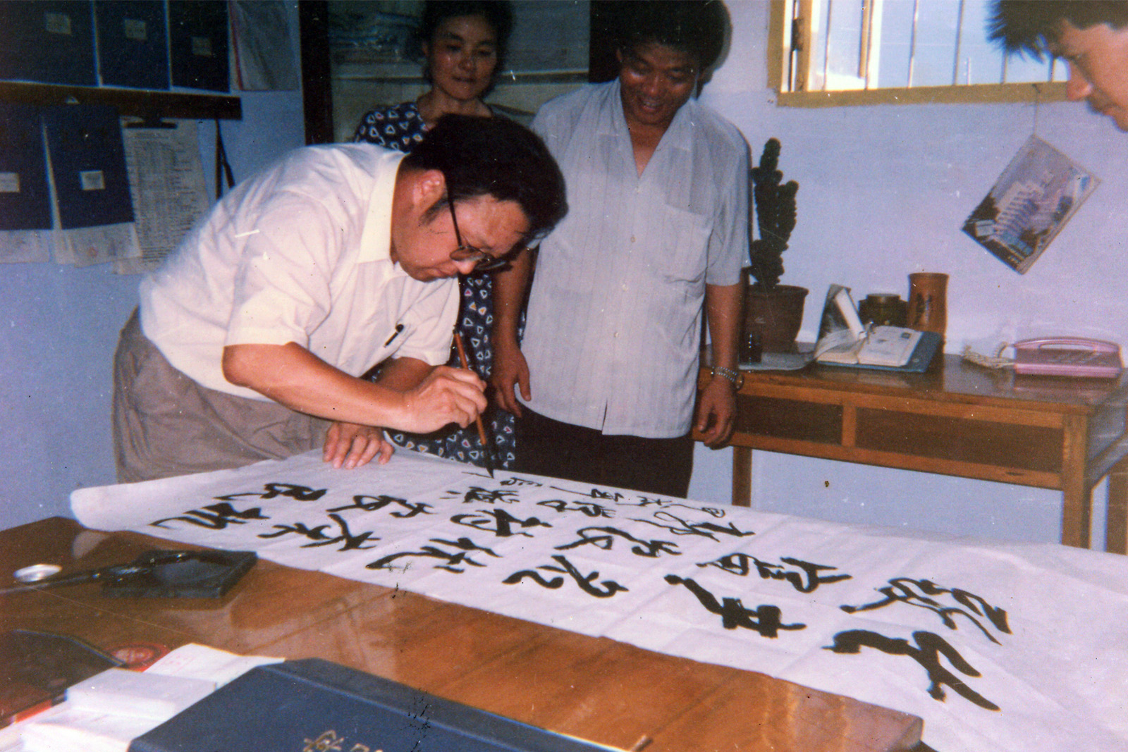 • 1990年, 衢州市委書(shū)記郭學(xué)煥來(lái)公司檢查指導(dǎo)工作。在聽(tīng)取公司總經(jīng)理程玉明對(duì)相關(guān)茶機(jī)產(chǎn)品的介紹后,潑墨提毫贊“生產(chǎn)名優(yōu)茶機(jī),致富農(nóng)村農(nóng)民”。