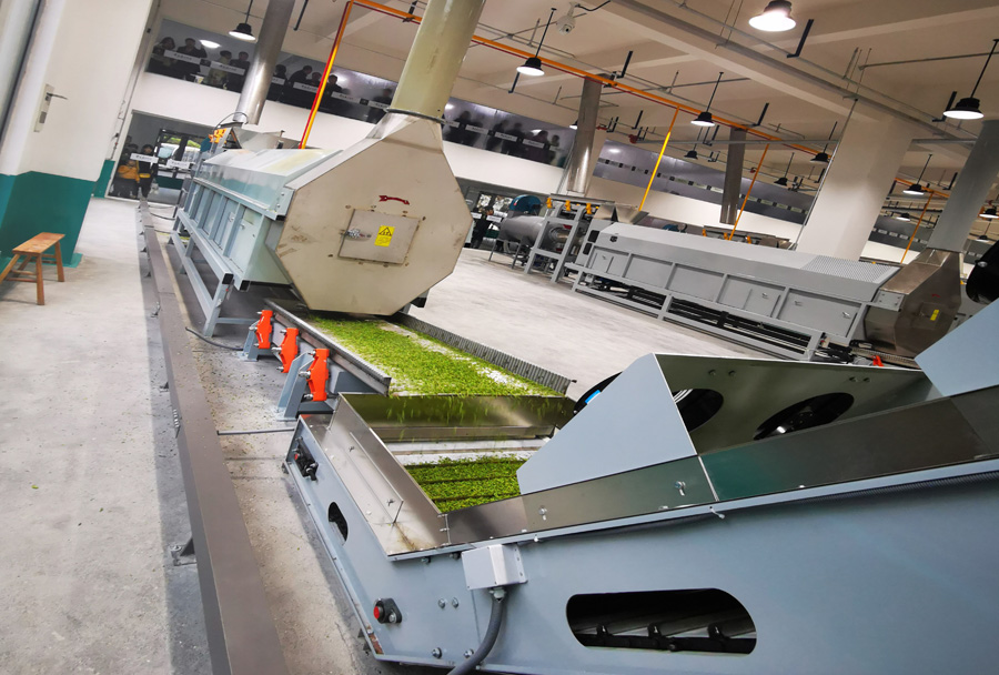 機組組成:本機組由鮮葉輸送機、超高溫熱風茶葉滾筒殺青機、冷卻輸送機、機組集成控制系統(tǒng)組成。