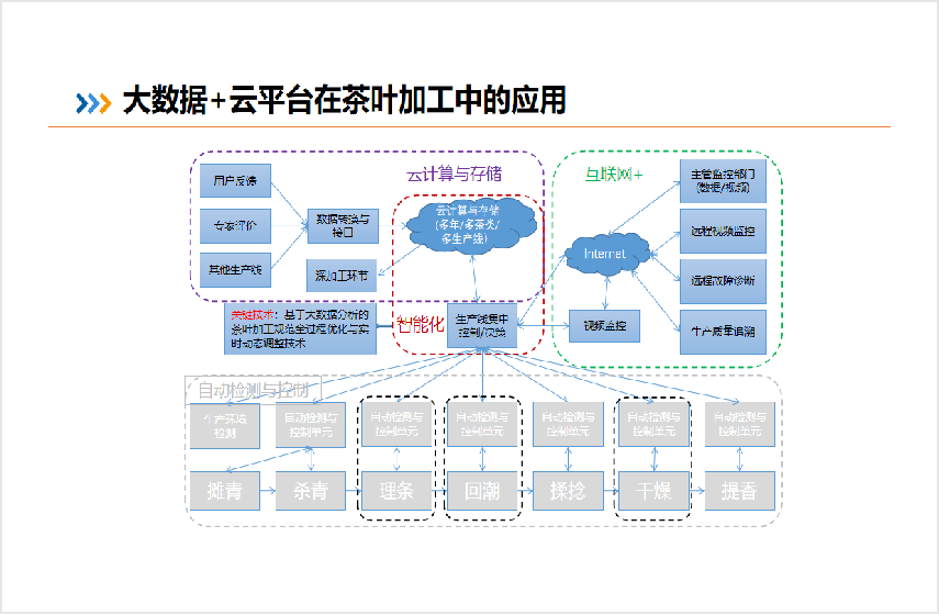 控制系統(tǒng)通過對(duì)茶葉加工生產(chǎn)線數(shù)字化管理與數(shù)據(jù)處理技術(shù)的研究,進(jìn)一步提升茶葉加工生產(chǎn)線的數(shù)字化管理水平,并通過加工品質(zhì)在線監(jiān)測(cè)與反饋實(shí)現(xiàn)一葉一策的加工模式,通過加工大數(shù)據(jù)的處理與分析為工藝優(yōu)化與設(shè)備改進(jìn)提供支撐。