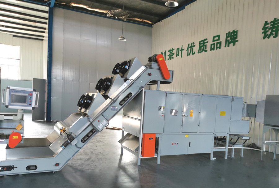 作業(yè)原理:機組采用搭接式結構,上料裝置與烘干箱體獨立,在防止漏茶的同時也減輕烘干機負載;采用臺灣輕型鏈條及雙滾輪、雙卷邊翻板,減少漏茶、夾茶 且降低運行噪音;等寬輸送使上料厚度更均勻;烘干箱體采用矩形管設計及石棉保溫處理,保證了烘箱四周的烘干溫度。
